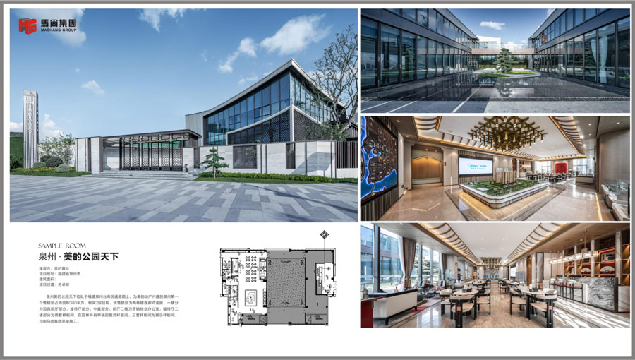 泉州美的公园天下位处于福建泉州台商区通港路上,为美的地产兴建的泉州第一个售楼部占地面积380平方,框架2层结构。该售楼部为两栋楼连廊式连接,一楼分为迎宾前厅部分,接待厅部分,中庭部分,前厅二楼为营销物业办公室,接待厅二楼部分为两套样板间,在园林外有单独的复式样板间。三套样板间为展示样板间,均由马尚集团承接施工。