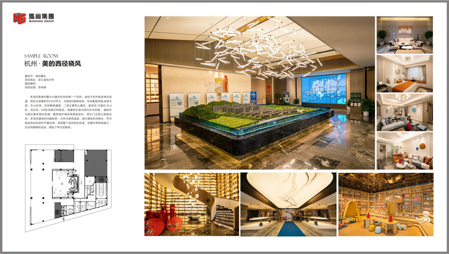 本项目是美的置业兴建在杭州的第一个项目,地处于杭州临安锦北街道,项目占地面积约三万平方,为框架4层框结构,马尚集团承接,迎宾大堂,办公区域,实体看房通道,二层主要有儿童区,接待区 沙盘区 办公区,洗手区,5M区及展示样板间,项建筑外观为现代中式风格 ,楼栋外立面主要采用灰色调,建筑物外墙采用高级涂料,部分门头配以高级石材,本项目遇到的问题较多,大件木家具造型、造价确定时间较长,甲方指定供应的材料严重迟滞,导至整个项目前松后紧,后期分两班制施工,在合同期顺利完成,得到了甲方的赞场。